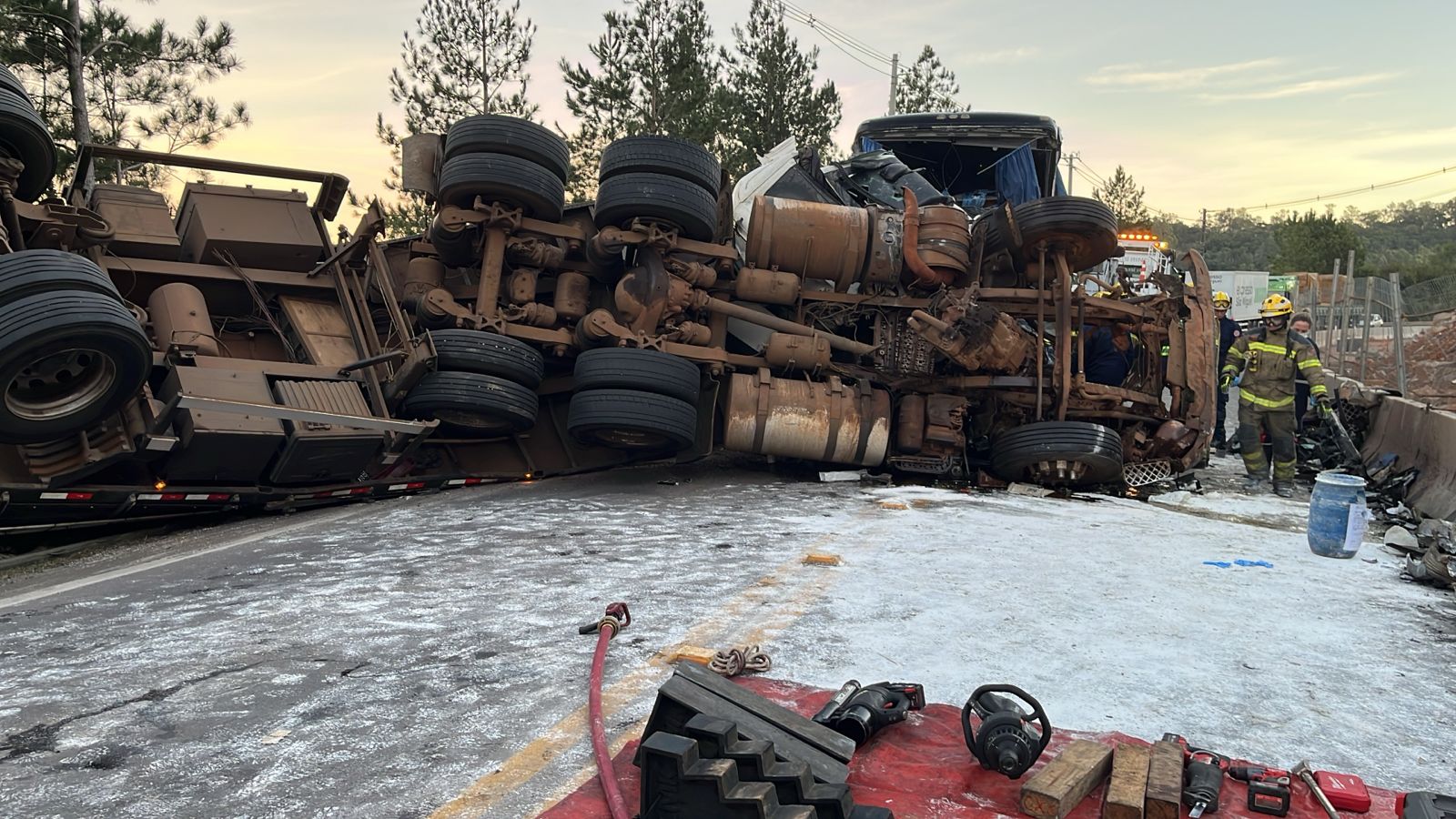 Colisão ocorreu próximo ao trevo de acesso à Linha 40; trânsito está bloqueado nos dois sentidos
