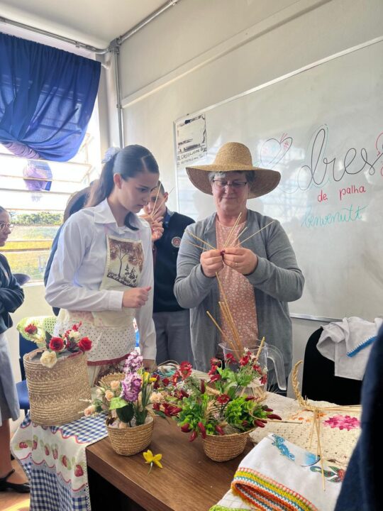Entre os destaques, estavam as oficinas culturais que encantaram alunos e visitantes: artesanato com palha, como na confecção de chapéus tradicionais; crochê, preservando saberes manuais; jogos típicos de cartas; exibição de um documentário sobre a imigração italiana; além de divertidos jogos coloniais que resgataram a infância dos nonos.