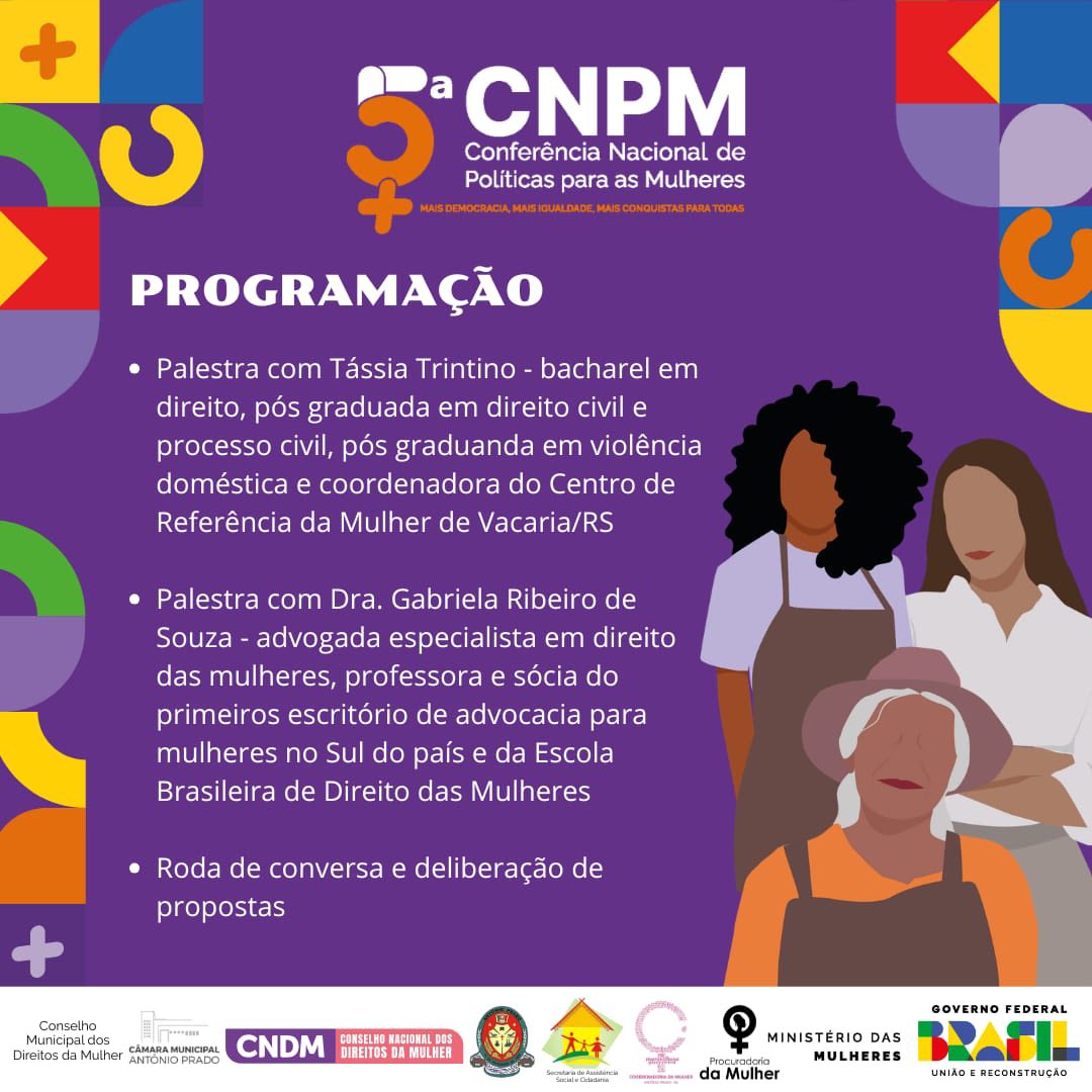 Antônio Prado realizará a 1ª Conferência Municipal de Políticas para as Mulheres no dia 25 de julho, das 13h30min às 17h30min, na Câmara Municipal de Vereadores.