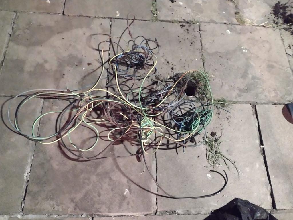 Chegando ao local mencionado pela testemunha foram encontrados dois homens em atitude suspeita. Um deles estava sentado em cima de um alicate, com o objetivo de esconde-lo; já o outro estava sentado em em um banco próximo segurando um saco cheio de fiação elétrica do seu lado.
