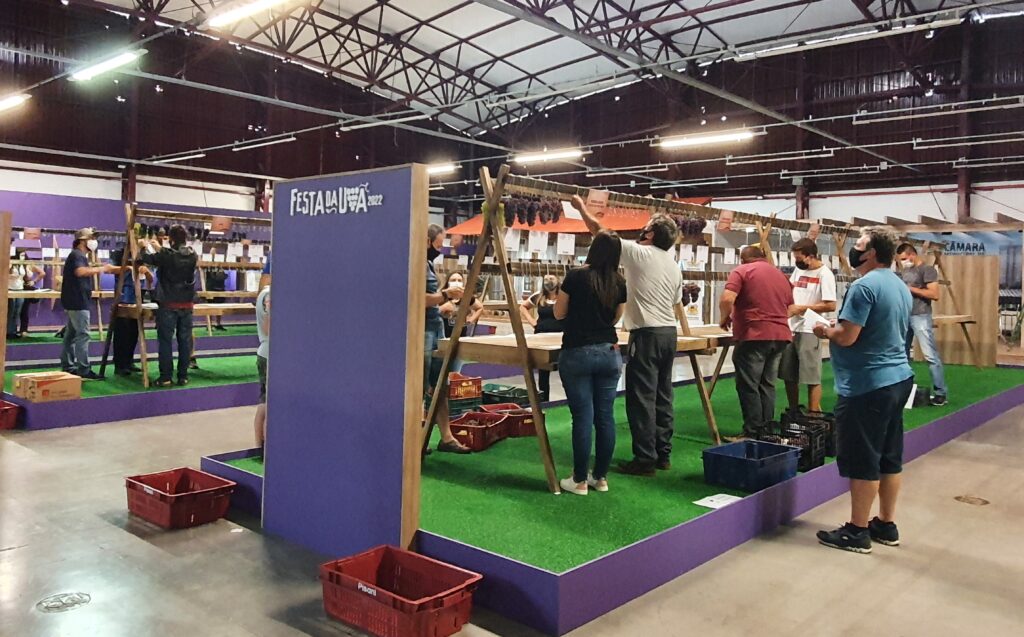 Técnicos da Secretaria Municipal da Agricultura, Pecuária e Abastecimento (SMAPA) auxiliaram produtores rurais a montar a Exposição de Uvas da Festa da Uva, durante a manhã desta quinta-feira (17). Das 8h às 10h, todos se dedicaram a fixar os cachos nos expositores colocados no mezanino do Centro de Eventos, no Parque Mário Bernardino Ramos.