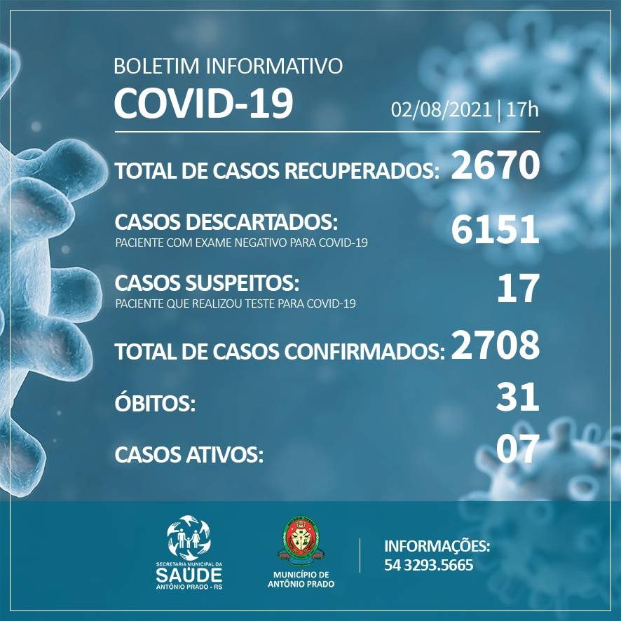 Conforme o boletim informativo o município possui atualmente sete casos ativos, 17 casos suspeitos, 6.151 descartados e 2670 recuperados.