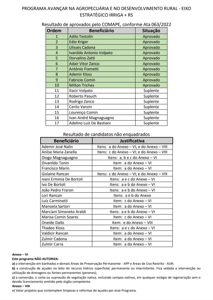 Confira na imagem abaixo o resultado da seleção. Os aprovados devem contatar o escritório da Emater de Nova Roma do Sul para organização da documentação elencada pelo programa.