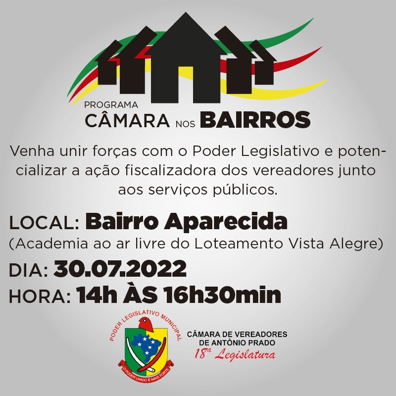 O bairro Aparecida será o próximo local a receber os vereadores pelo Programa Câmara nos Bairros. Por se tratar de um bairro populoso, foi decidido fazer dois turnos, na manhã e na tarde do próximo sábado (30). Confira abaixo os horários e locais: