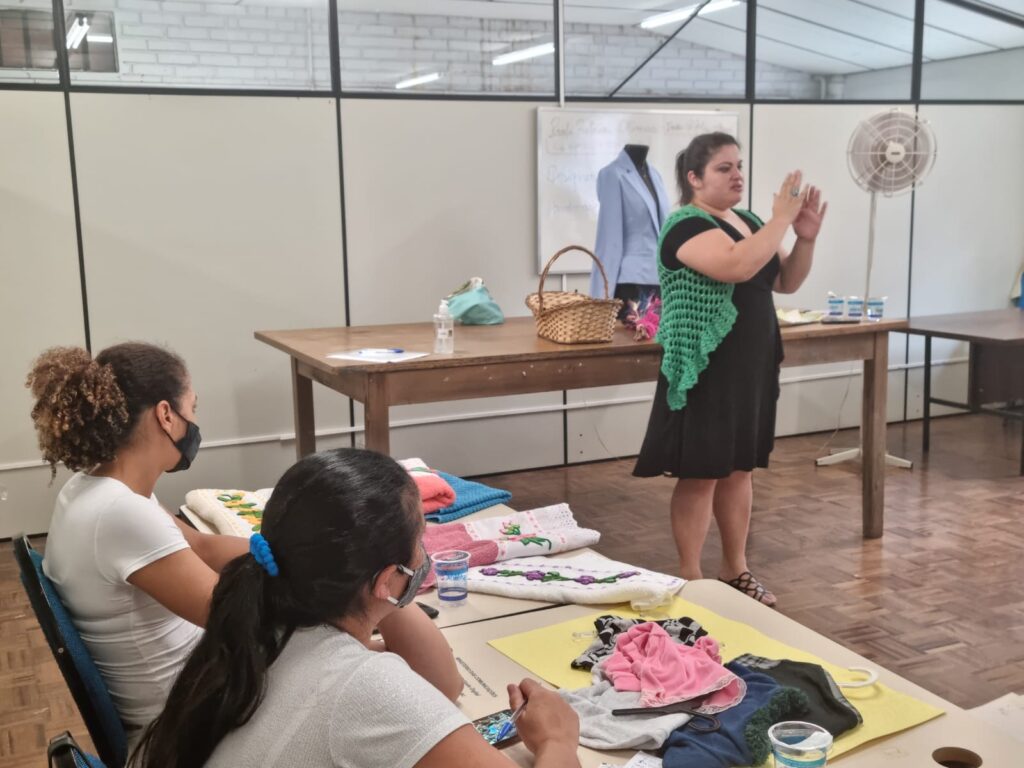 Nesta semana, o Banco do Vestuário promoveu um ciclo de palestras sobre vendas, marketing, vendas pela internet e abordagem ao cliente para alunas da entidade. As capacitações foram conduzidas pela educadora social em tricô, crochê e macramê, Rebeca de Oliveira e Silva, que também atua como coach, vitrinista e visual merchandising.