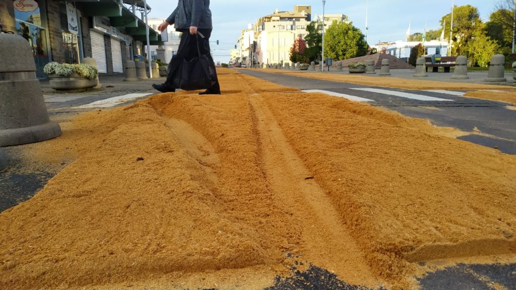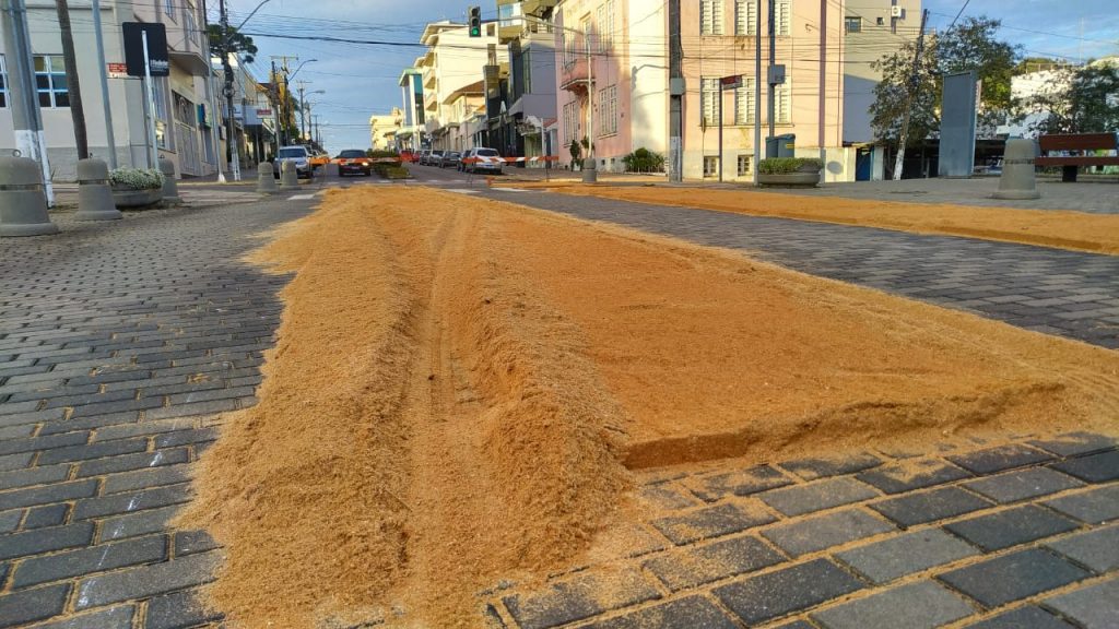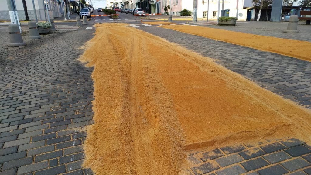 Um veículo não identificado invadiu a base de tapetes de Corpus Christi em frente à Igreja Nossa Senhora de Lourdes, em Flores da Cunha. Os quadros de serragem foram confeccionados na terça-feira (1º), pelos funcionários da Secretaria Municipal de Obras.