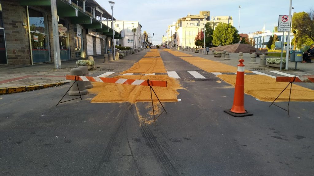 No começo da manhã desta quarta-feira (2), foram notados os estragos na base de serragem dos tapetes na Avenida 25 de Julho. Não há informações se trata-se de um ato de vandalismo ou se o condutor do veículo não viu os cavaletes que bloqueavam a passagem.