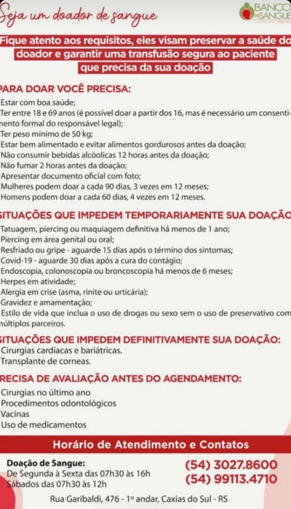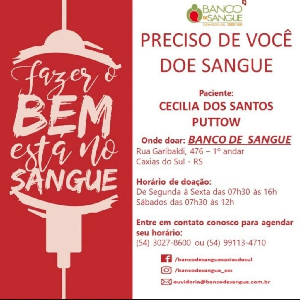 Quem puder e quiser ajudar deve ir até o Banco de Sangue, na rua Garibaldi 476, no centro de Caxias do Sul. A transfusão é no nome da bebê Cecília dos Santos Puttow. O horário de doação de sangue é de segunda á sexta-feira, das 7h30min às 16h. Ou aos sábados das 7h 30min ao meio dia.