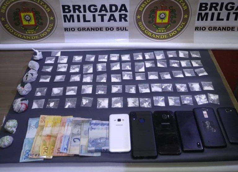 Em ações de combate ao tráfico de drogas e homicídios a Brigada Militar (BM) de Garibaldi prendeu um homem, de 19 anos, e apreendeu dois menores, de 16 e 17 anos. O fato ocorreu na Rua Porto Alegre, bairro Bela Vista II, na noite desta quinta-feira (16), por volta das 23h, quando os policiais militares suspeitaram da atitude dos indivíduos, que tentaram fugir da abordagem, mas acabaram detidos. Com eles foram apreendidas 66 porções de cocaína, sete porções de maconha, seis aparelhos celulares e R$ 208 em dinheiro.
