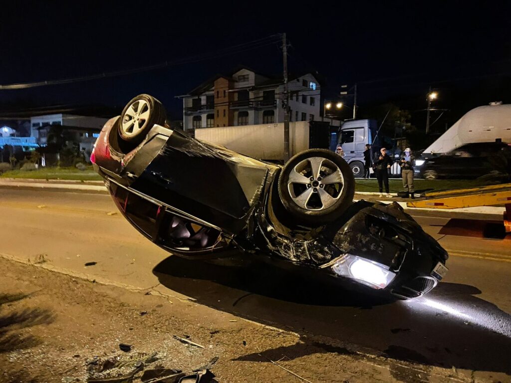 Um veículo Chevrolet Cruze capotou na avenida 25 de Julho, em Flores da Cunha, por volta das 21h desta sexta-feira (15). O acidente aconteceu próximo da rótula de acesso à cidade, na frente da Antoniazzi Renovadora de Pneus.