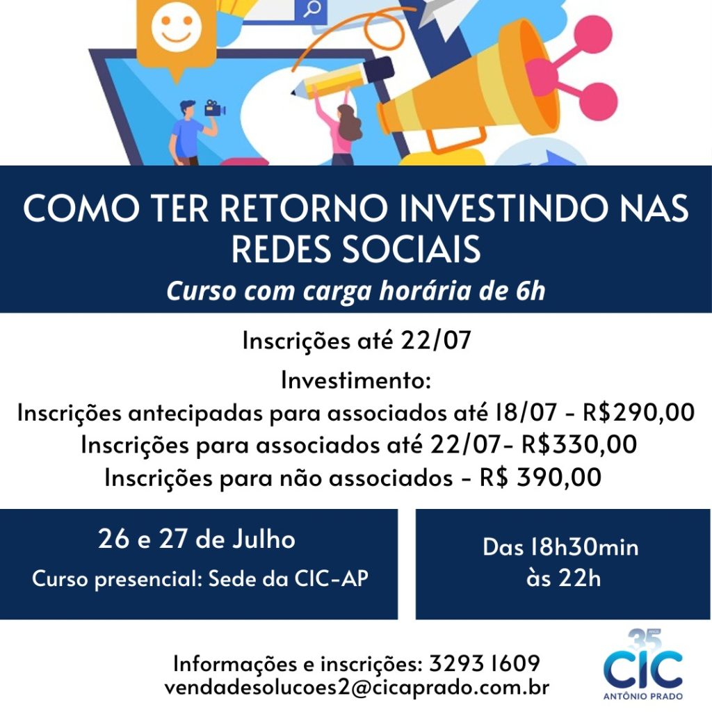 A CIC Antônio Prado abriu as inscrições para seu novo curso “Como Ter Retorno Investindo nas Redes Sociais”, com carga horário de 6h.