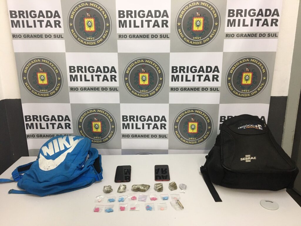De acordo com informações da Brigada Militar (BM), equipes do 4° Batalhão de Polícia de Choque (4Bpchoq) realizavam patrulhamento motorizado de rotina pelo bairro Rio Branco quando avistaram dois indivíduos em atitude suspeita. Segundo os policiais, ao realizar a revista foi encontrado com os indivíduos seis porções de maconha; 43 comprimidos de ecstasy; uma mochila azul; dois aparelhos celulares e R$ 100,00. Os dois homens, ambos com 20 anos, foram conduzidos à Delegacia de Polícia para registro dos fatos.