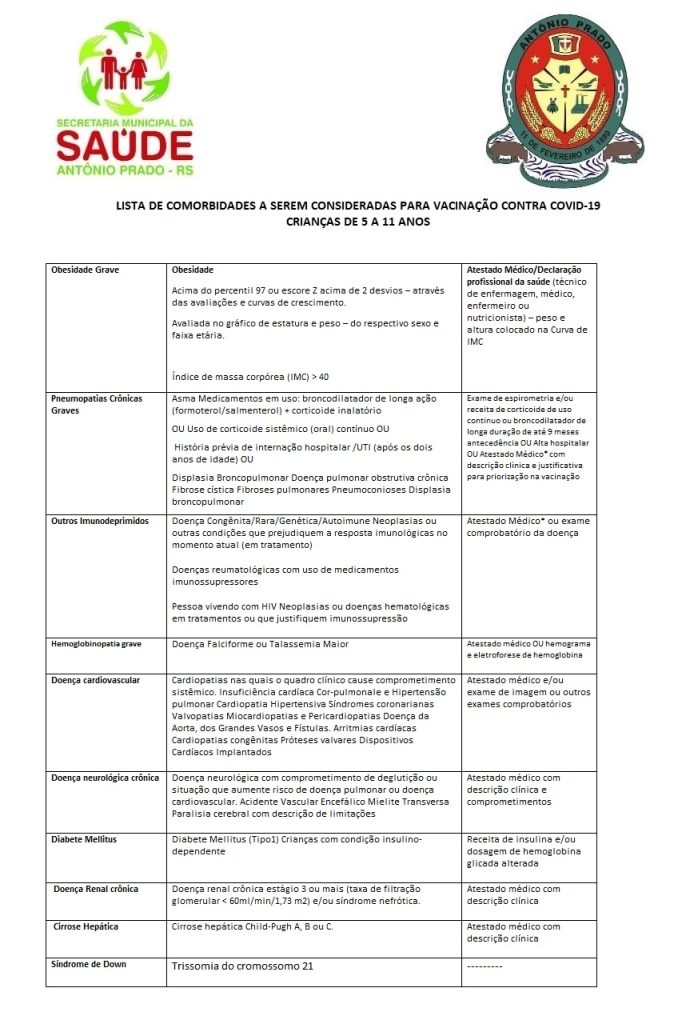 Confira a lista de comorbidades contempladas em Antônio Prado, abaixo: