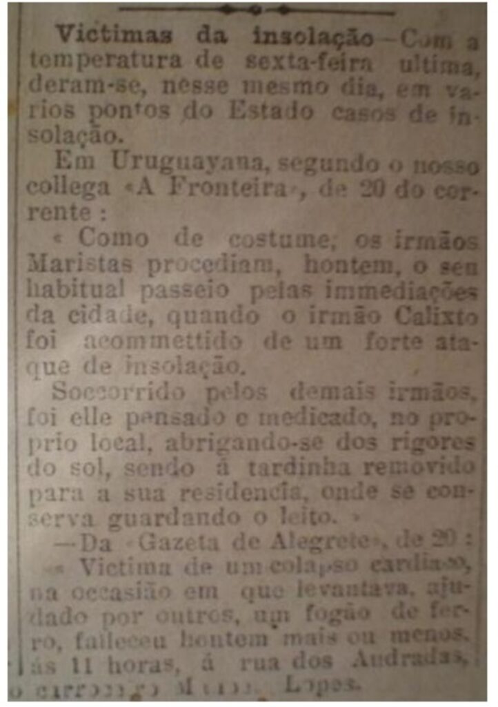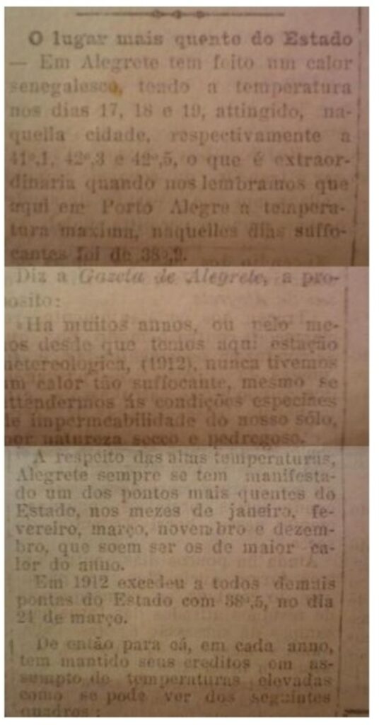 Diz a Gazeta de Allegrete, a propósito: ‘Há muitos anos, ou pelo menos desde que aqui temos estação meteorológica, (1912) nunca tivemos um calor tão sufocante, mesmo se attendermos às condições especiaes de impermeabilidade do nosso sólo, por natureza secco e pedregoso. A respeito das altas temperaturas, Alegrete sempre tem se manifestado um dos pontos mais quentes do Estado, nos mezes de janeiro, fevereiro, março, novembro e dezembro, que soem ser os de maior calor do ano. Em 1912 excedeu a todas demais pontas do Estado com 38,5ºC, no dia 21 de março. De então para cá, em cada anno, tem mantido seus créditos em assumpto de temperaturas elevadas”.