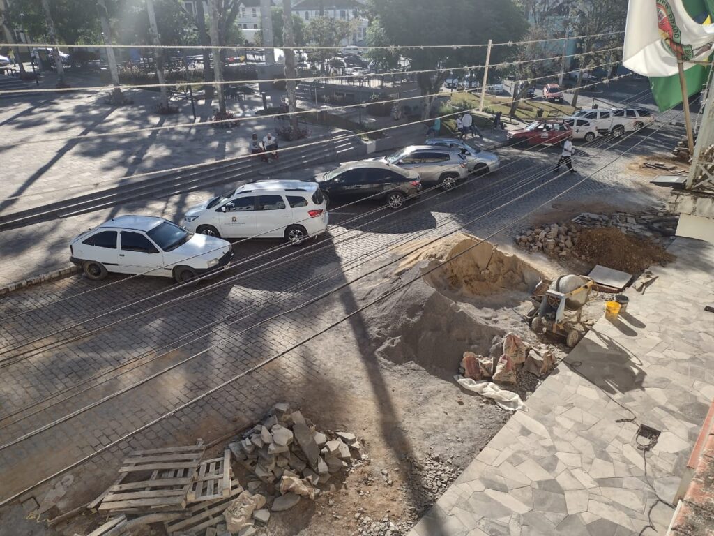 Licitada em 2020, na administração anterior, ouve a retirada da calçada antiga somente no final de dezembro. Retomados os trabalhos em janeiro, foram paralisados por apresentarem, além de outros, problemas no acabamento.