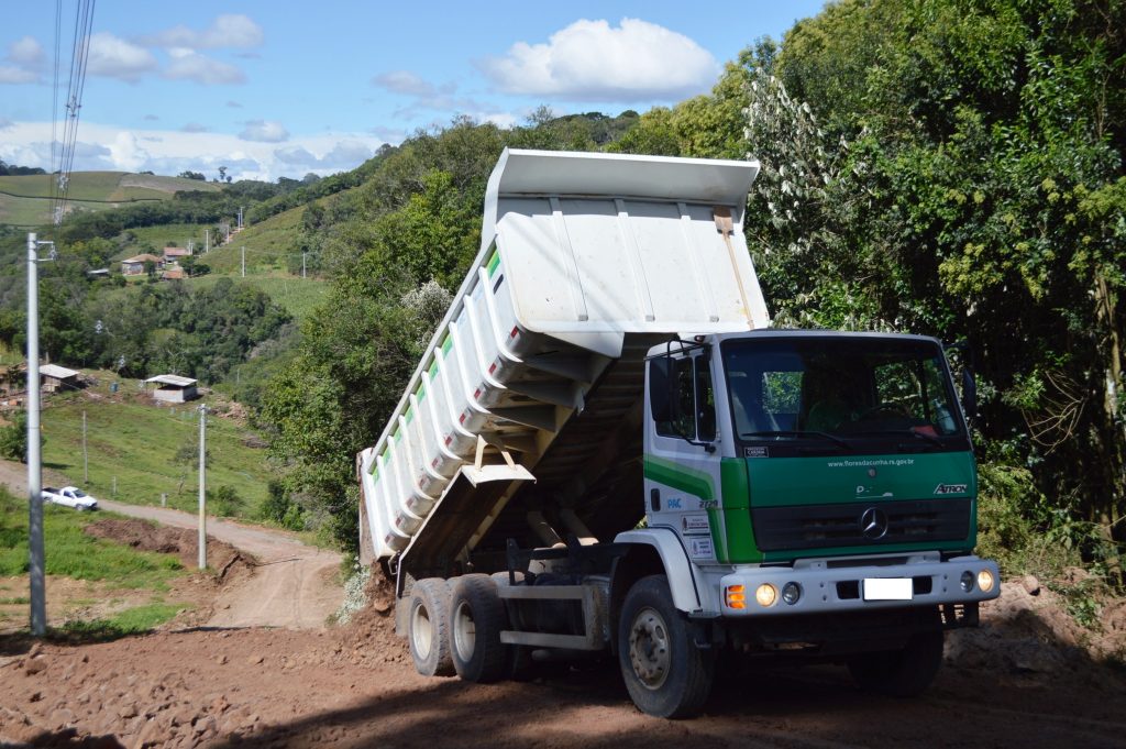 Para realizar o serviço, foram utilizadas 21 cargas de material transportado em caminhões-caçamba. Além disso, o prolongamento da estrada de 2,5 km recebeu patrolamento e cascalhamento.