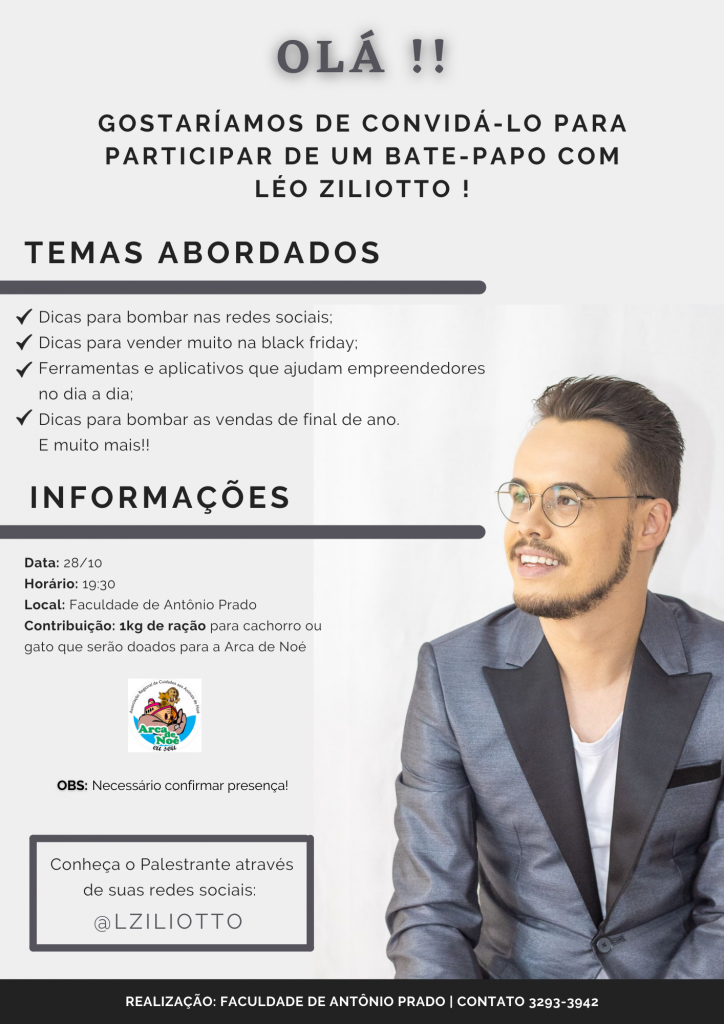 A Faculdade de Antônio Prado (FAP) realiza hoje (28), às 19h30min, palestra com o designer de moda e influenciador digital, Leonardo Ziliotto.