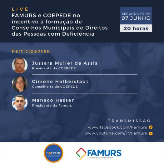 A live “Famurs e Copede no incentivo à formação de Conselhos Municipais de Direitos das Pessoas com Deficiência” será realizada segunda-feira (07), às 20h, com transmissão pelo Facebook e canal no YouTube da Famurs. São convidados para o encontro a presidente do Coepede, Jussara Muller de Assis, a conselheira Cimone Halberstadt e o presidente da Federação, Maneco Hassen.