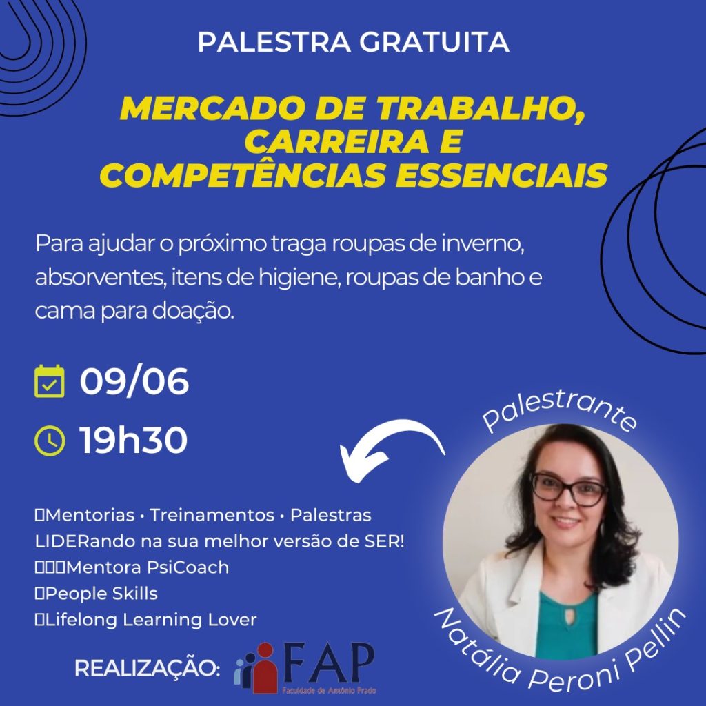 Nesta quinta-feira (09), às 19h30min terá uma palestra no auditório da Faculdade de Antônio Prado (FAP), sobre Mercado de Trabalho, carreira e competências essenciais.