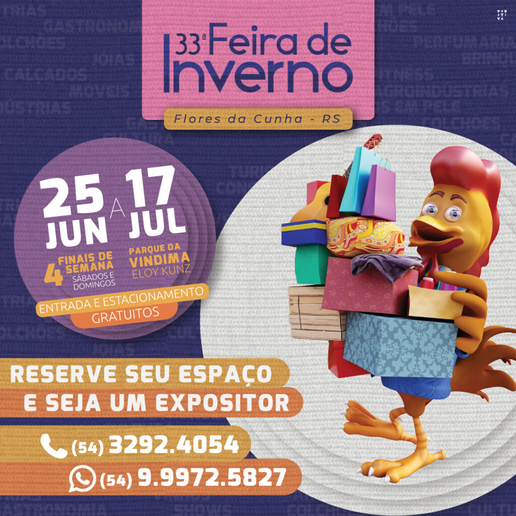 Considerada uma das pioneiras nesse segmento multissetorial, a 33ª Feira de Inverno é uma realização da Terra do Galo Positiva, tem patrocínio do Círculo Saúde e apoio da Prefeitura Municipal de Flores da Cunha, Serrasul Telecom e entidades.