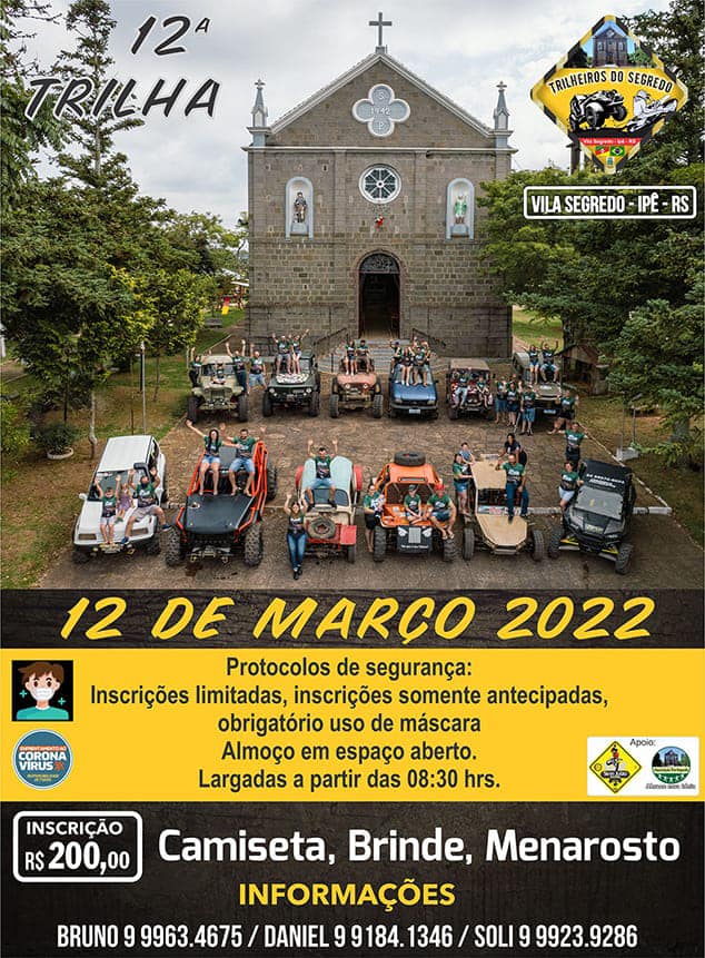 Neste sábado (12), acontece a 12ª trilha da Vila Segredo. O evento já característico tem largada na Praça da Igreja a partir das 08h30min. Será percorrido um trajeto de aproximadamente 35 km por entre três capelas da região.