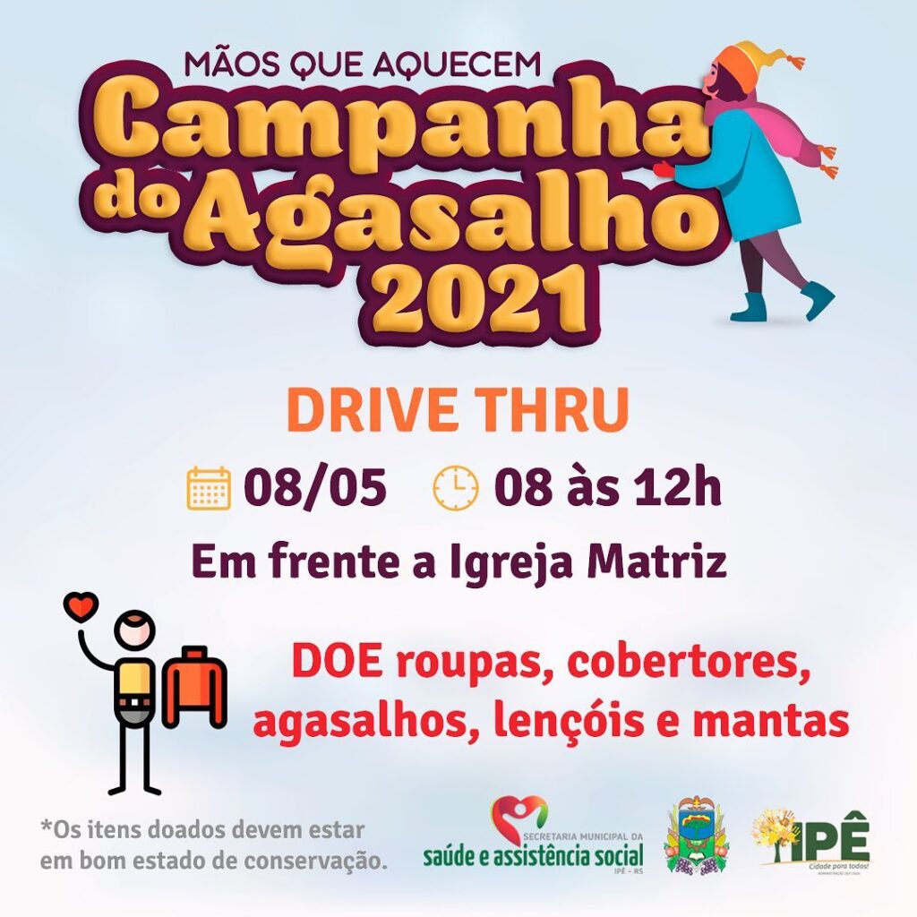 O município de Ipê lança neste sábado (08), a campanha do agasalho 2021 denominada “Mãos que Aquecem”. A ação está sendo realizada pela Secretaria de Saúde e Assistência Social em conjunto ao CRAS e a um grupo de voluntários. O evento de lançamento ocorre no horário das 8h às 12h em frente à Igreja Matriz.