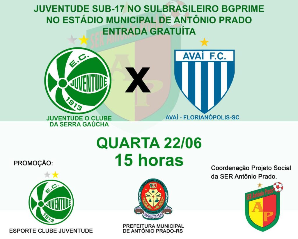 Nesta quarta-feira(22), às 15h, a equipe do Juventude Sub 17 tem jogo decisivo em Antônio Prado contra o Avaí, atualmente as duas equipes dividem as primeiras posições do campeonato SulBrasileiro Sub 17 BGPrime com nove pontos.