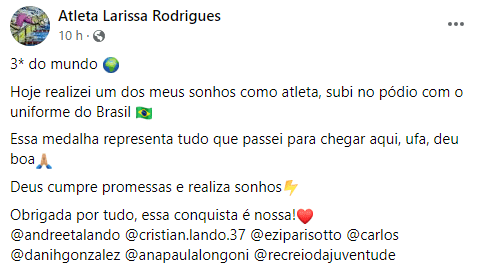 Para a atleta a medalha representa alivio e uma grande emoção que foi expressada em uma publicação em sua redes sociais.