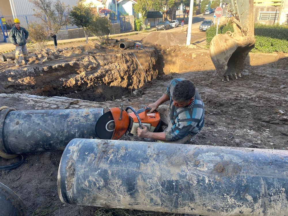 Equipes do Samae, comando 25 pessoas, estão se revezando em três turnos de trabalho para resolver o problema em uma adutora localizada na rua Silveira Martins, no bairro Cristo Redentor. A rede de fibrocimento, ainda da década de 60, apresentou diversos rompimentos pelo seu desgaste. Além disso, a tubulação foi implantada transversalmente, dificultando ainda mais a substituição do trecho por necessidade de peças especiais.