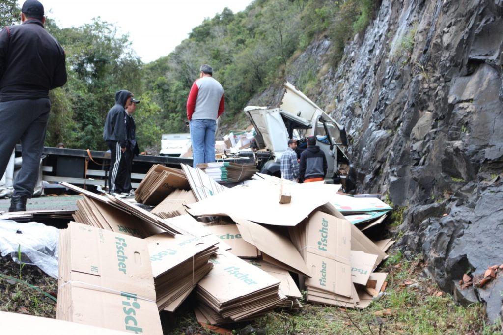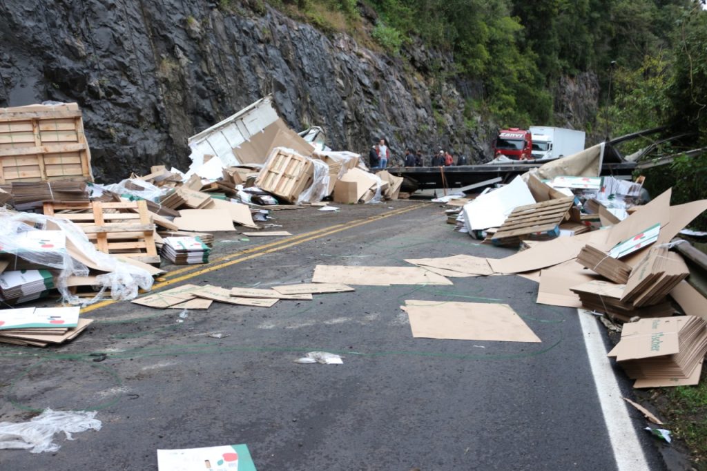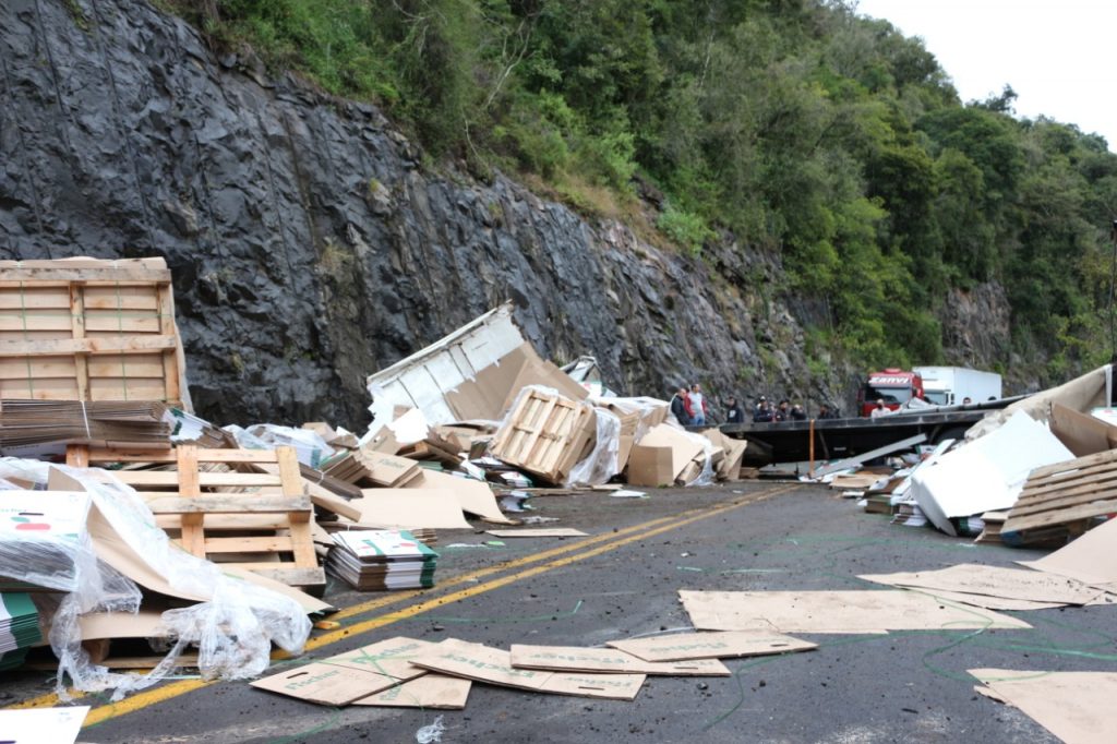 De acordo com testemunhas, o caminhão carregado com paletes de embalagens de papelão, seguia no sentido Flores-Antônio Prado, quando no km 108, o motorista perdeu o controle, invadiu a pista contrária, bateu no talude de pedras e parou sobre a pista. Toda carga ficou espalhada na estrada.