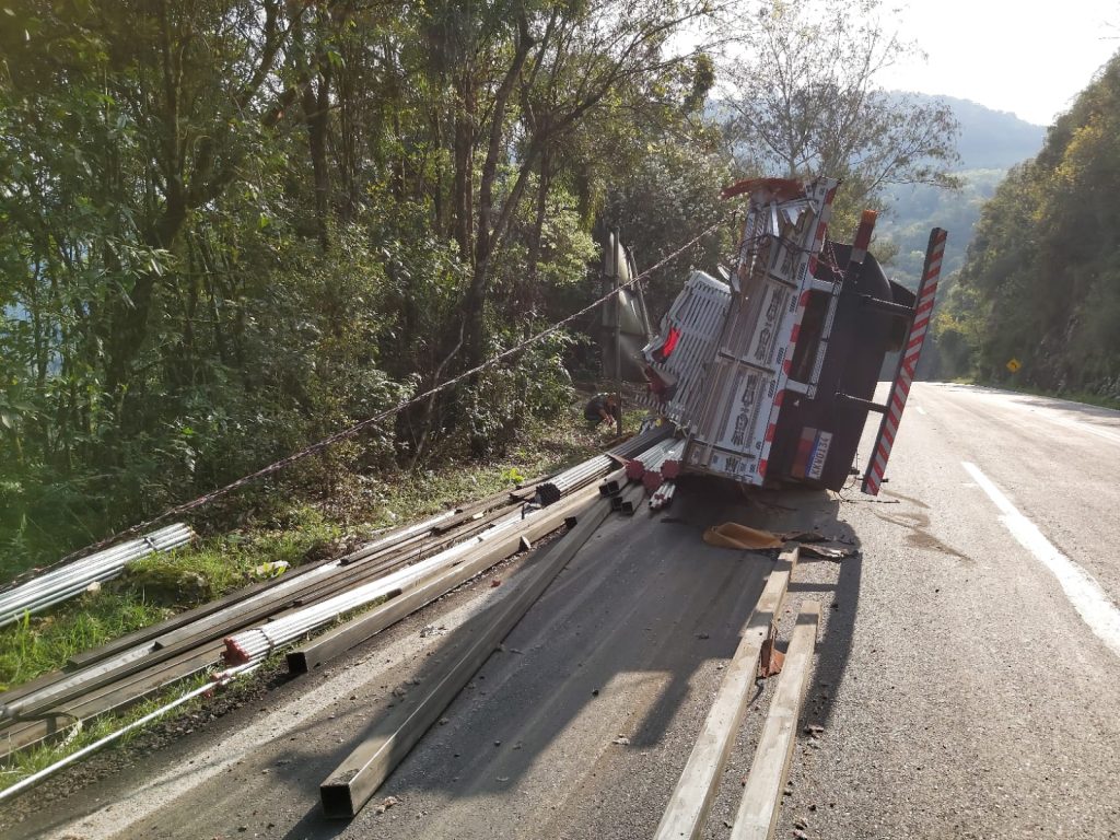 O condutor de um caminhão Mercedes Benz 1620 se feriu em um acidente no km-112 da ERS-122, em Antônio Prado. O acidente foi registrado por volta das 8h desta sexta-feira (3), na Serra das Antas. O condutor do caminhão carregado de barras de ferro seguia no sentido Antônio Prado-Flores da Cunha, quando por motivos desconhecidos acabou perdendo o controle do veículo e tombando sobre a pista.