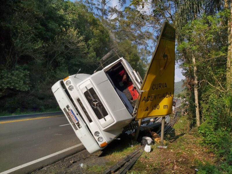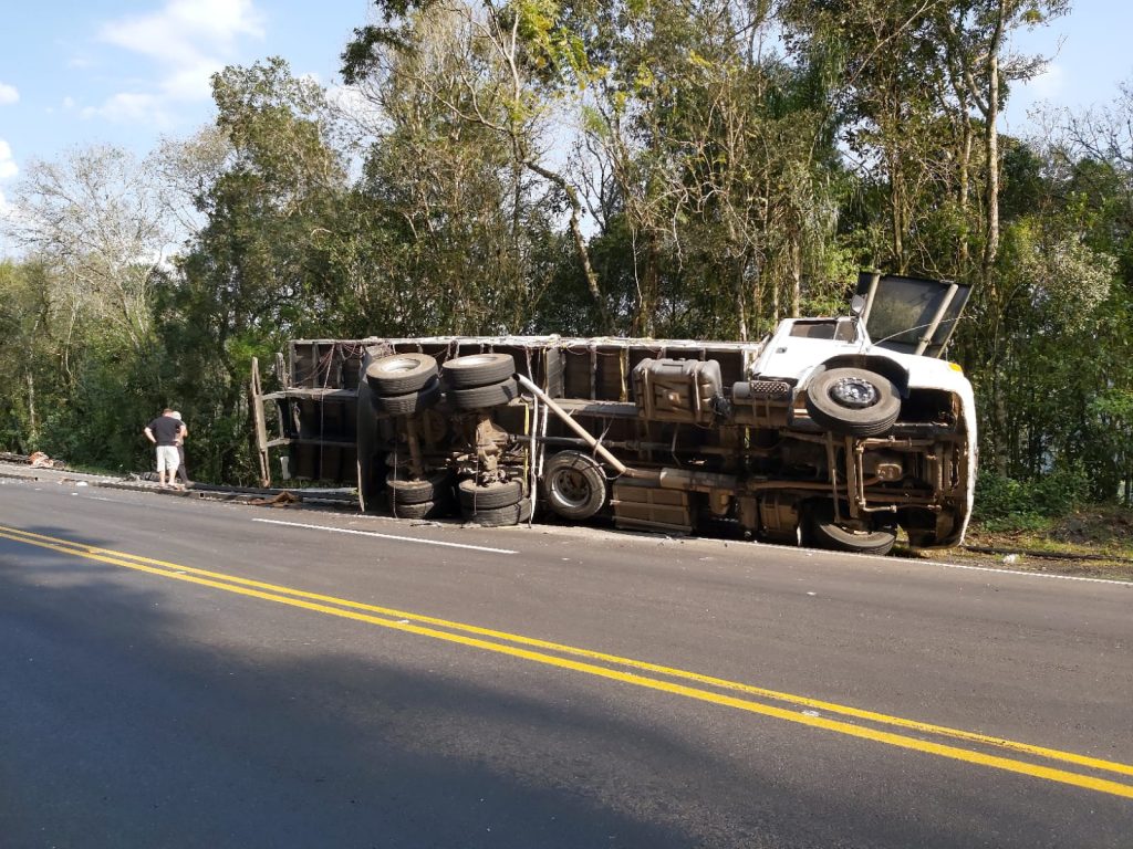 O caminhão ainda colidiu em uma placa de sinalização de trânsito e bloqueou uma das três pistas que há no local. Segundo informações de testemunhas, o motorista sofreu alguns ferimentos no braço e foi encaminhado ao Hospital Fátima de Flores da Cunha para receber atendimento.