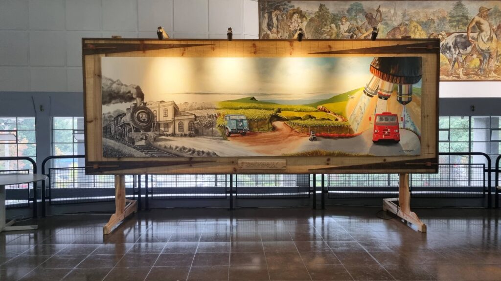 Da chegada do trem à inovação tecnológica. Esse é o caminho do desenvolvimento econômico no Município de Caxias do Sul, desde 1910 até os dias atuais, e tema da obra pintada pelo artista local Anilto Caureo, durante a realização do Solo de Inovação, durante a realização da Festa da Uva 2022.