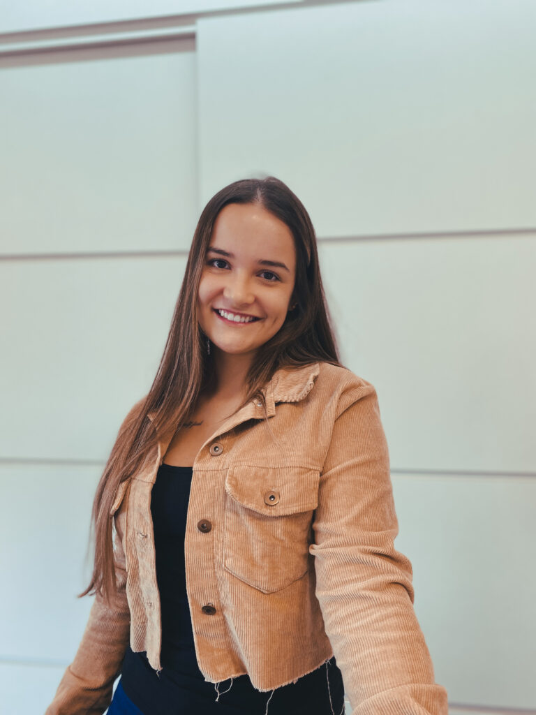 Amanda Fracasso, 21 anos, caixa, 1,65m altura, 62 quilos, manequim 36.