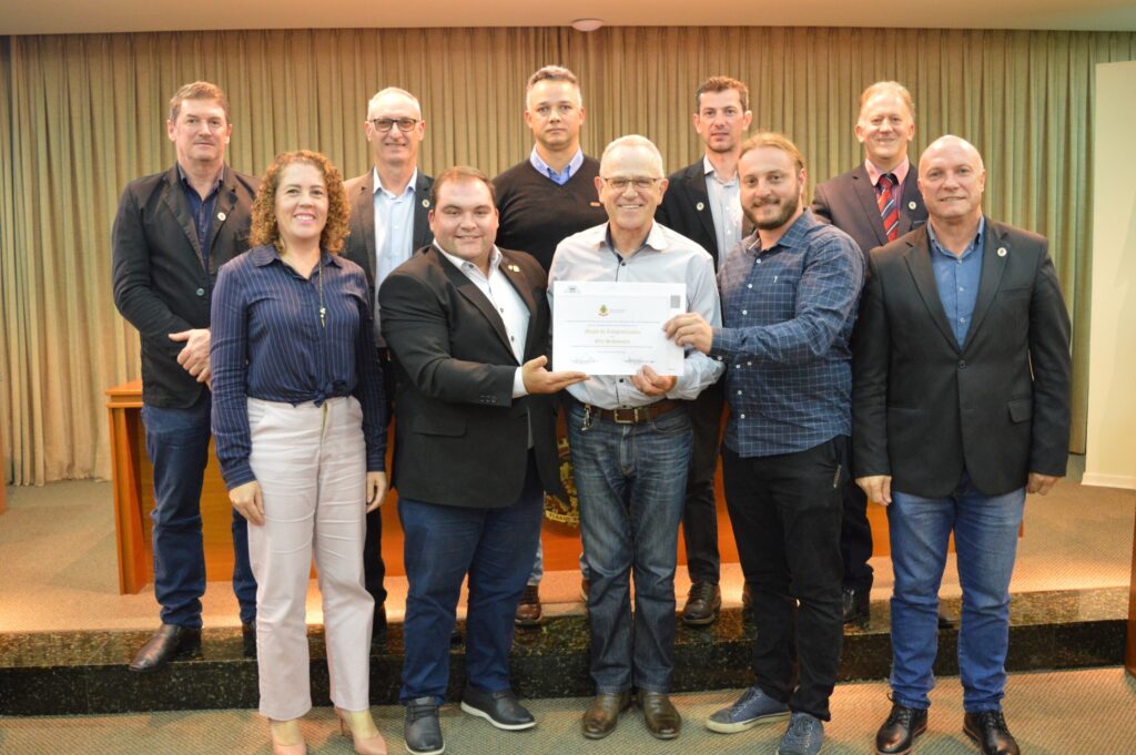 A Câmara Municipal de Flores da Cunha entregou, nesta segunda-feira (25), uma Moção de Congratulações ao presidente do Sindicato dos Trabalhadores Rurais de Flores da Cunha e Nova Pádua, Olir Schiavenin. A proposta de autoria do vereador Carlos Roberto Forlin (MDB) é extensiva a toda a diretoria e associados, pelos 60 anos de história.