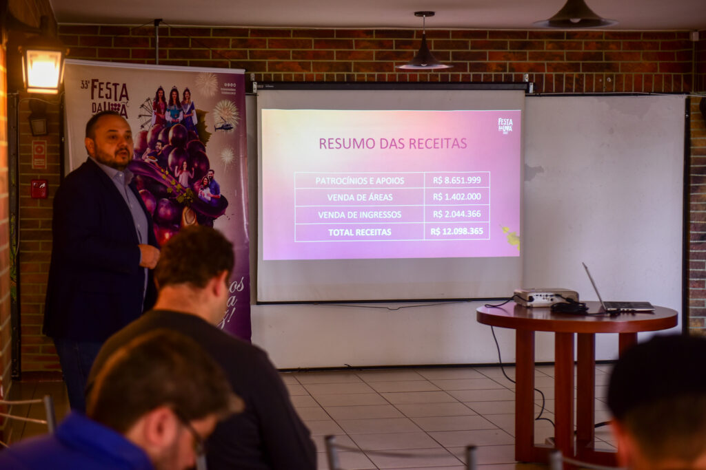 Após, Luciano Pereira apresentou o resultado financeiro da edição. Foram arrecadados com patrocínios, venda de áreas e biheteria R$ 12.098.365,00. Neste valor está incluso o apoio do município no valor de R$ 4,5 milhões (recurso aprovado pela Câmara Municipal). Este recurso, por ser público, detalhado pelo diretor executivo na ocasião, foi usado na compra, armazenagem, distribuição das uvas (parte do total), jantar e premiação dos vitivinicultores, iluminação, sonorização, arquibancadas e carros alegóricos do Desfile Cênico Musical, locação e montagem de cenários, locação do parque, pagamento do ECAD da festa e em serviços de limpeza e segurança.