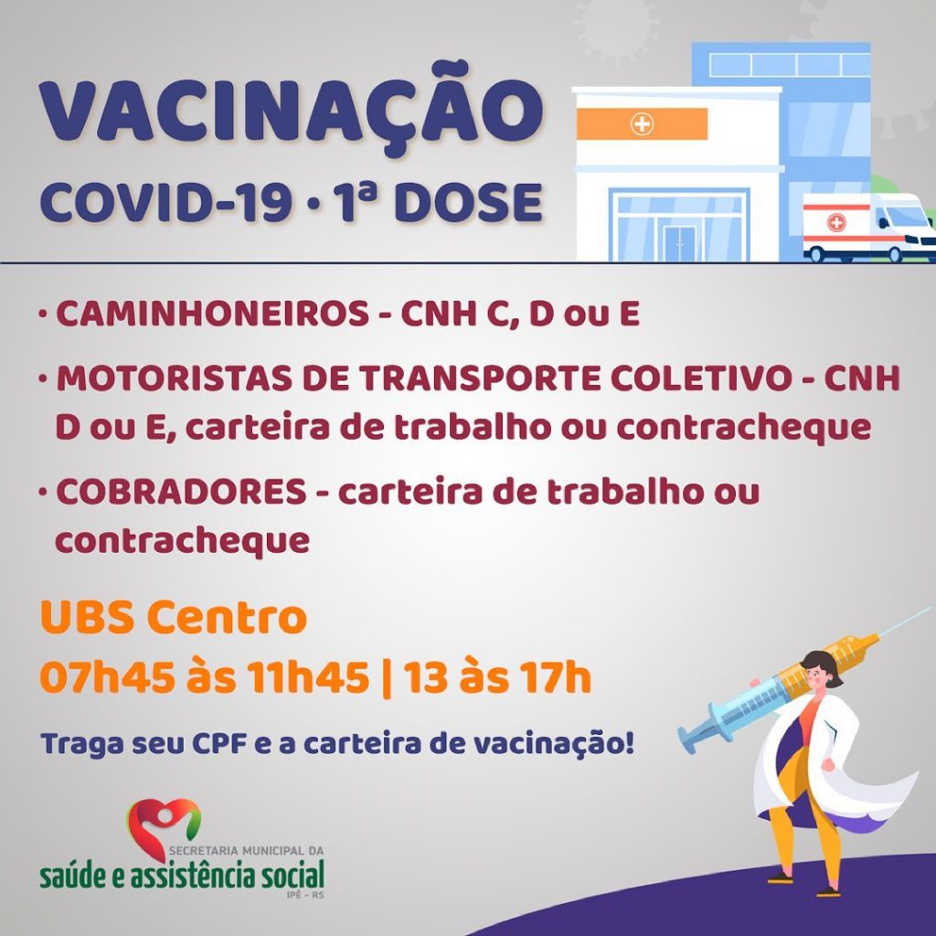 A Secretaria de Saúde e Assistência Social inicia amanhã (22), no horário de atendimento da UBS, a vacinação em caminhoneiros, motoristas de transporte coletivo e cobradores.