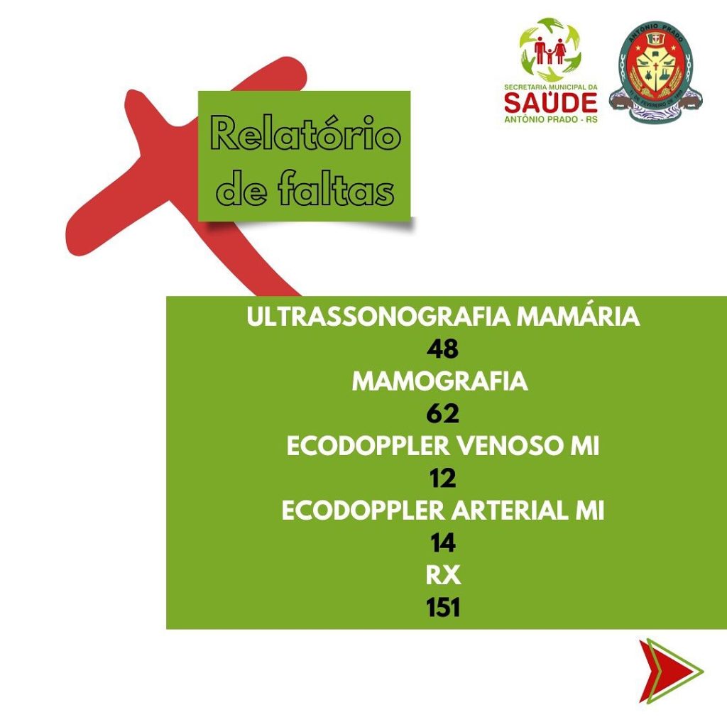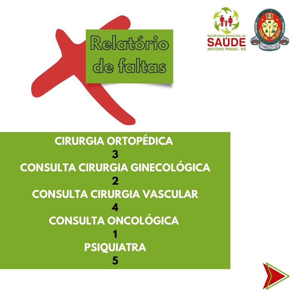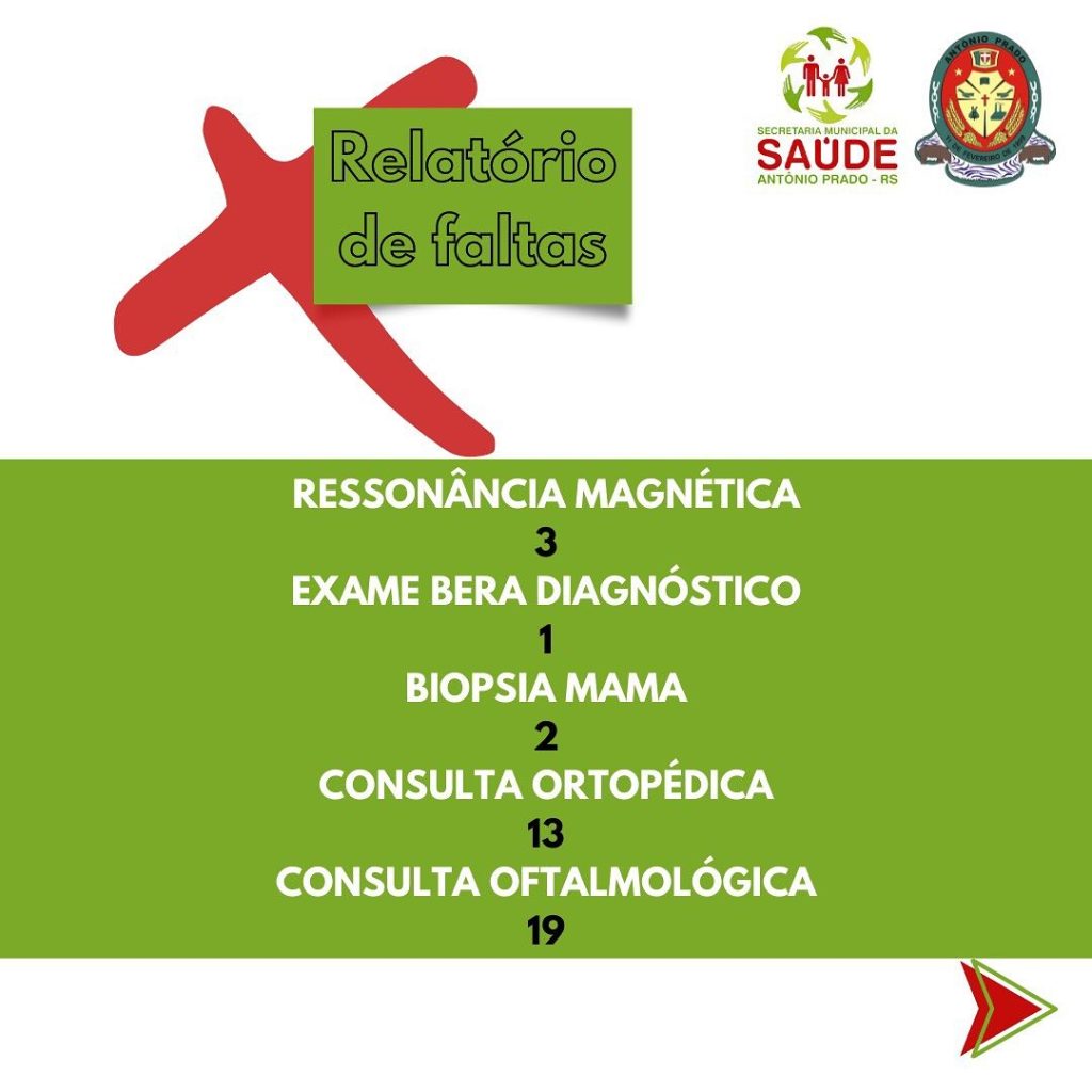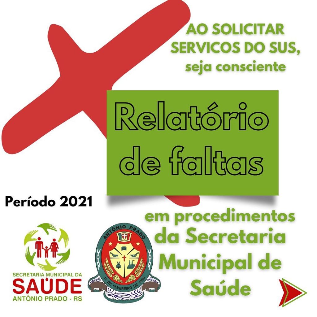 A Secretaria Municipal de Saúde de Antônio Prado divulgou nesta sexta-feira (14) um relatório de faltas em atendimentos e demais procedimentos e ressaltou a importância do comparecimento nas datas e horários marcados. “O não comparecimento nos exames/consultas/cirurgias prejudica o seu atendimento e o de todos que necessitam do serviço de saúde.”