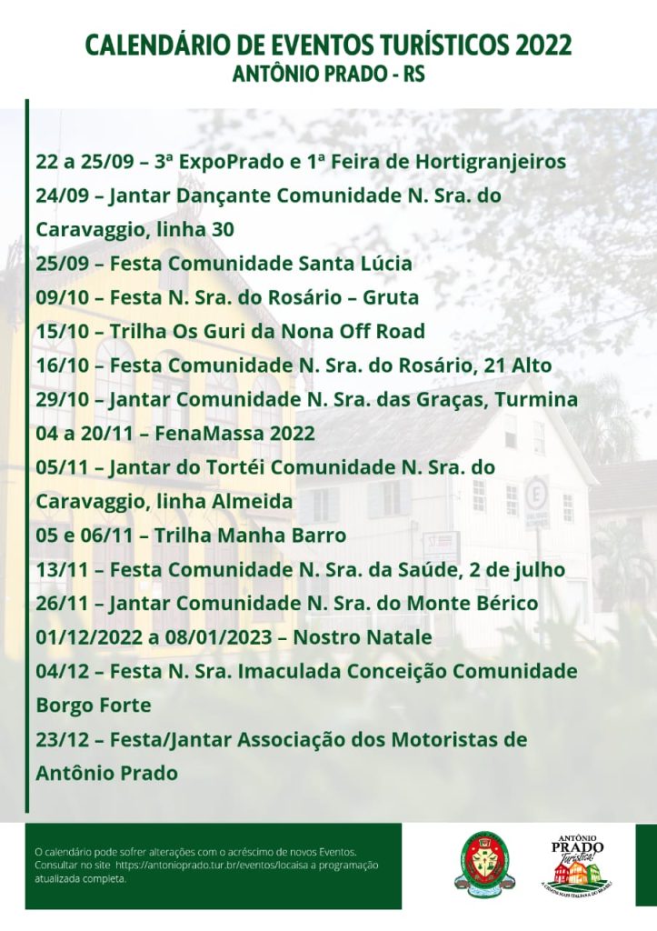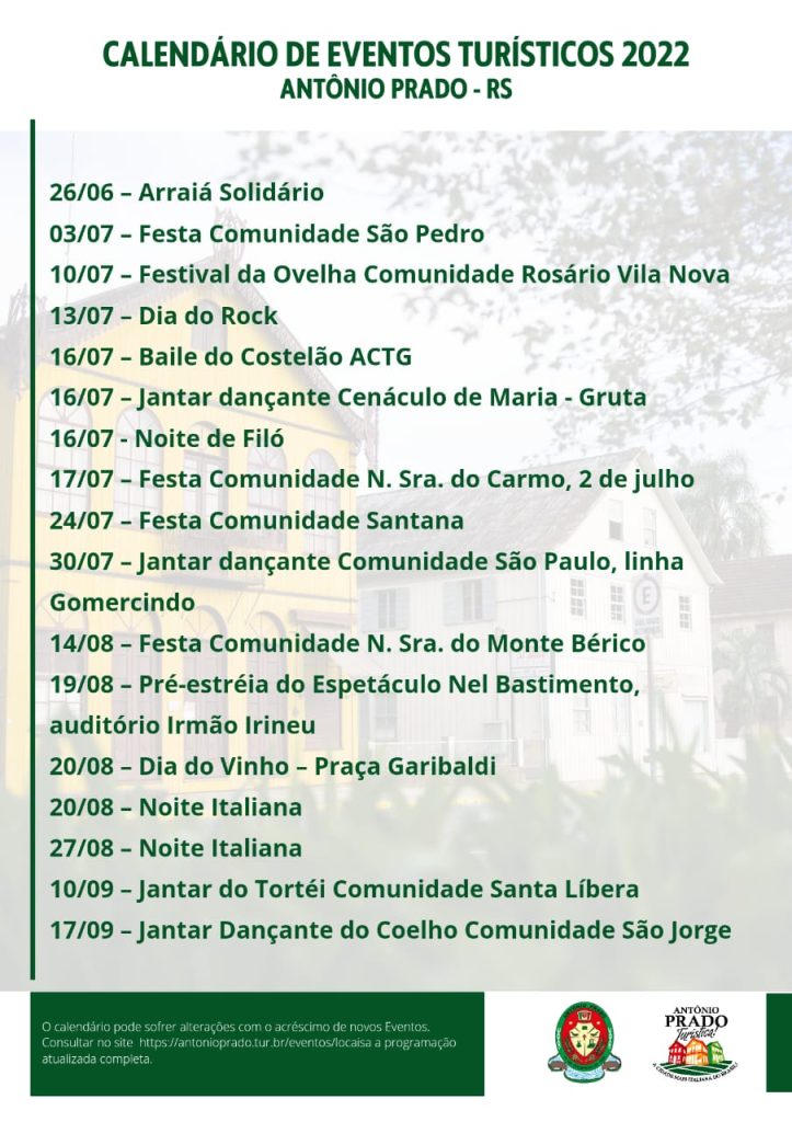 Com a retomada dos eventos, a Secretaria Municipal de Comércio e Turismo de Antônio Prado reuniu os principais eventos turísticos do município em um calendário virtual que pode ser acessado através do novo site www.antonioprado.tur.br/.