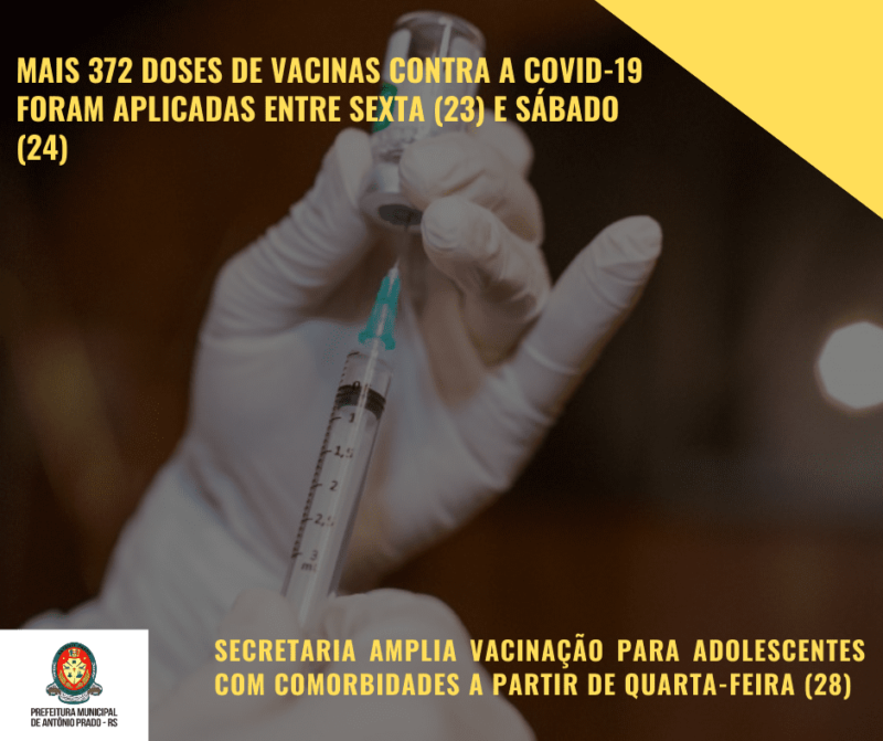 Entre sexta (23) e sábado (24), 372 doses de vacinas contra a Covid-19 foram aplicadas em Antônio Prado