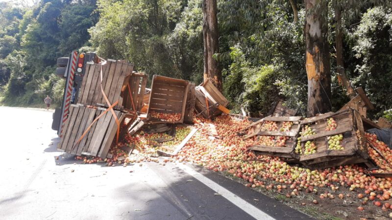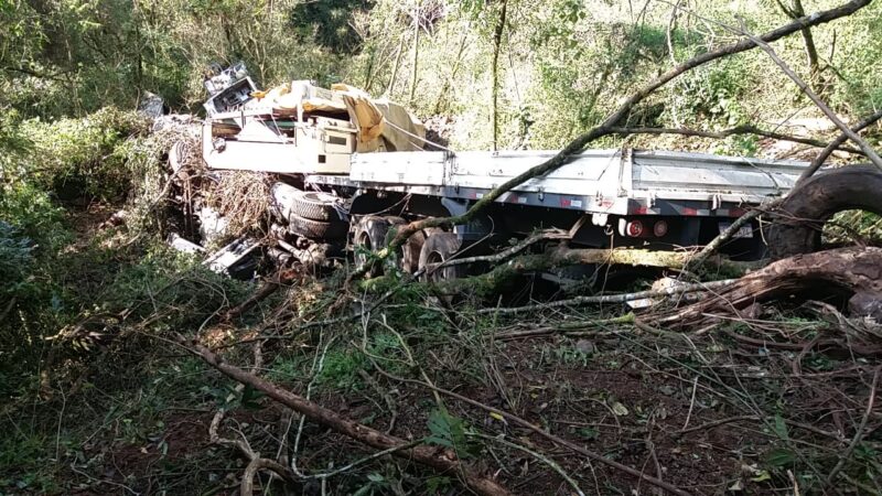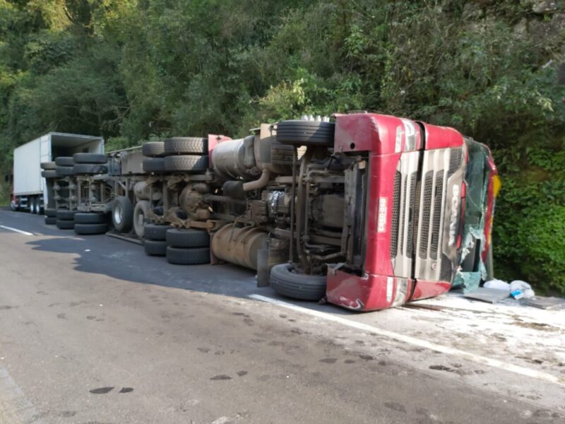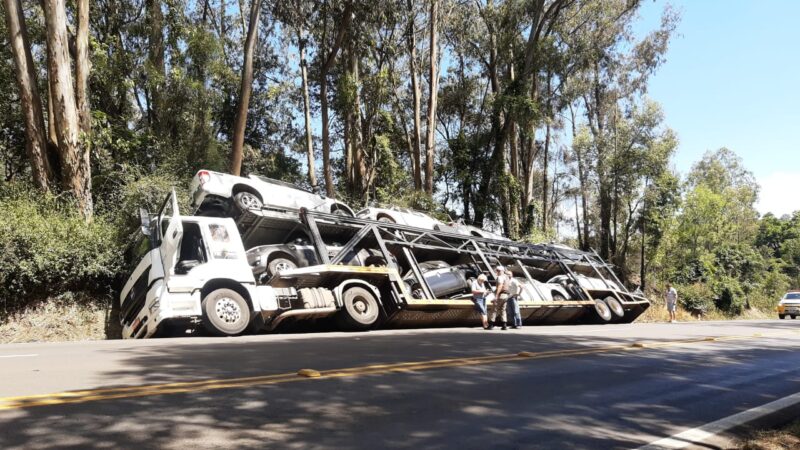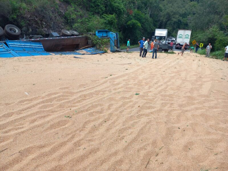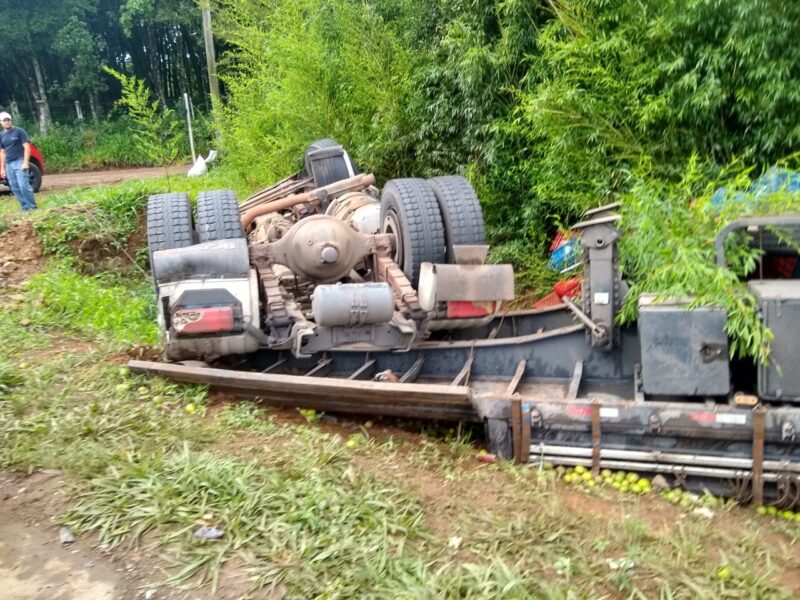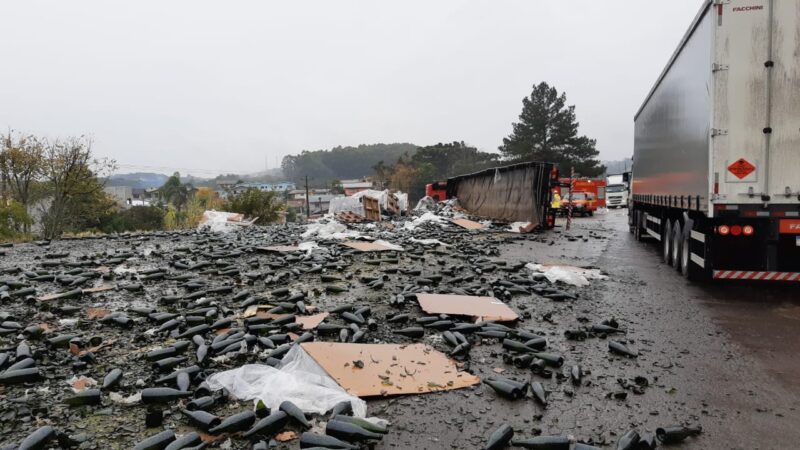 Carreta que transportava arroz tomba na ERS-122, em São Vendelino