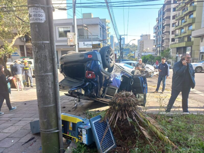 Carro capota e vai parar em cima da calçada após acidente no centro de Caxias do Sul