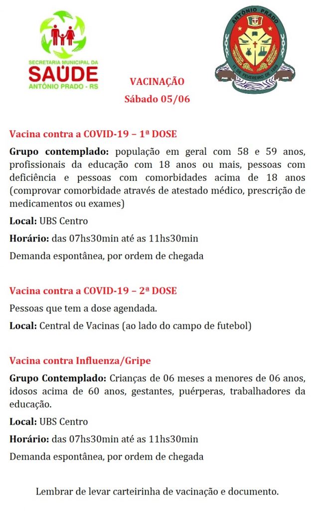 A vacinação contra gripe também ocorre neste sábado, no horário da 7h30 às 11h30, na Unidade Básica de Saúde do Centro, sem agendamento e por ordem de chegada.