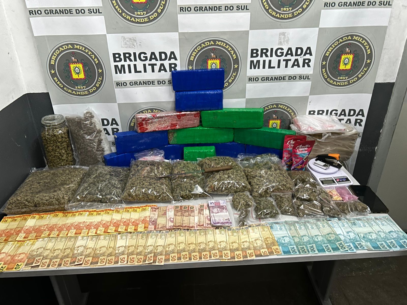 Foram apreendidos aproximadamente 10kg de maconha distribuídos em 12 tijolos e porções do tipo camarão, uma porção de haxixe, 124 comprimidos de ecstasy, uma porção de LSD, duas balanças de precisão, um celular, ziplocks diversos, dois cigarros eletrônicos com caneta de maconha, além de R$ 2.780,00 em dinheiro.