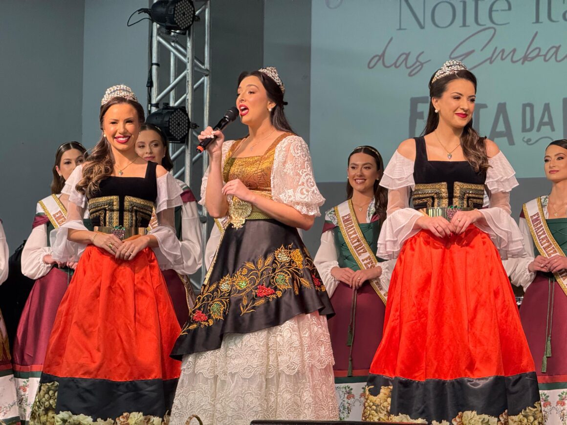 As 12 candidatas ao título de Rainha e princesas da Festa da Uva 2026 receberam neste sábado (5), na Noite Italiana das Embaixatrizes, em Caxias do Sul, as tiaras e as faixas de embaixatrizes do evento. Os adereços, criados especialmente para as jovens, foram entregues pelas embaixatrizes da Festa da Uva 2024.