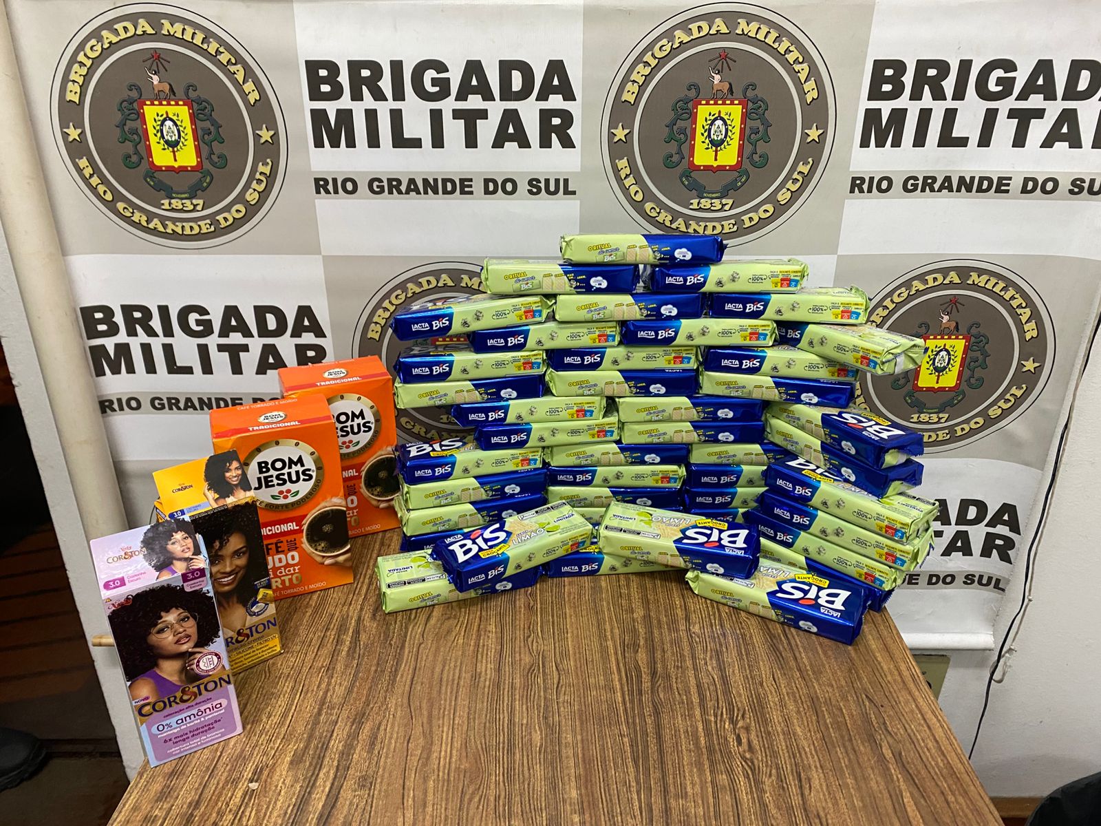 Segundo a Brigada Militar (BM), ele foi flagrado com uma mochila contendo 44 caixas de chocolate, duas pacotes de 500 gramas de café e duas caixas de tintura para cabelo. O valor dos itens é estimado em R$ 380.