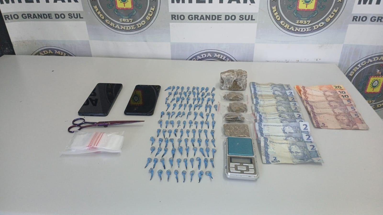 Na ação, foram apreendidas 108 pedras de crack, cinco porções de maconha, uma balança de precisão e materiais utilizados para fracionar e embalar drogas.