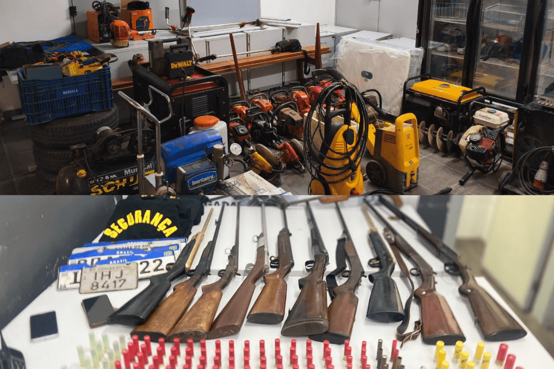 Durante a ação, a BM apreendeu armas de fogo, munições, drones agrícolas, maquinários, ferramentas industriais, colete balístico, placas de veículos, a camionete e outros materiais.