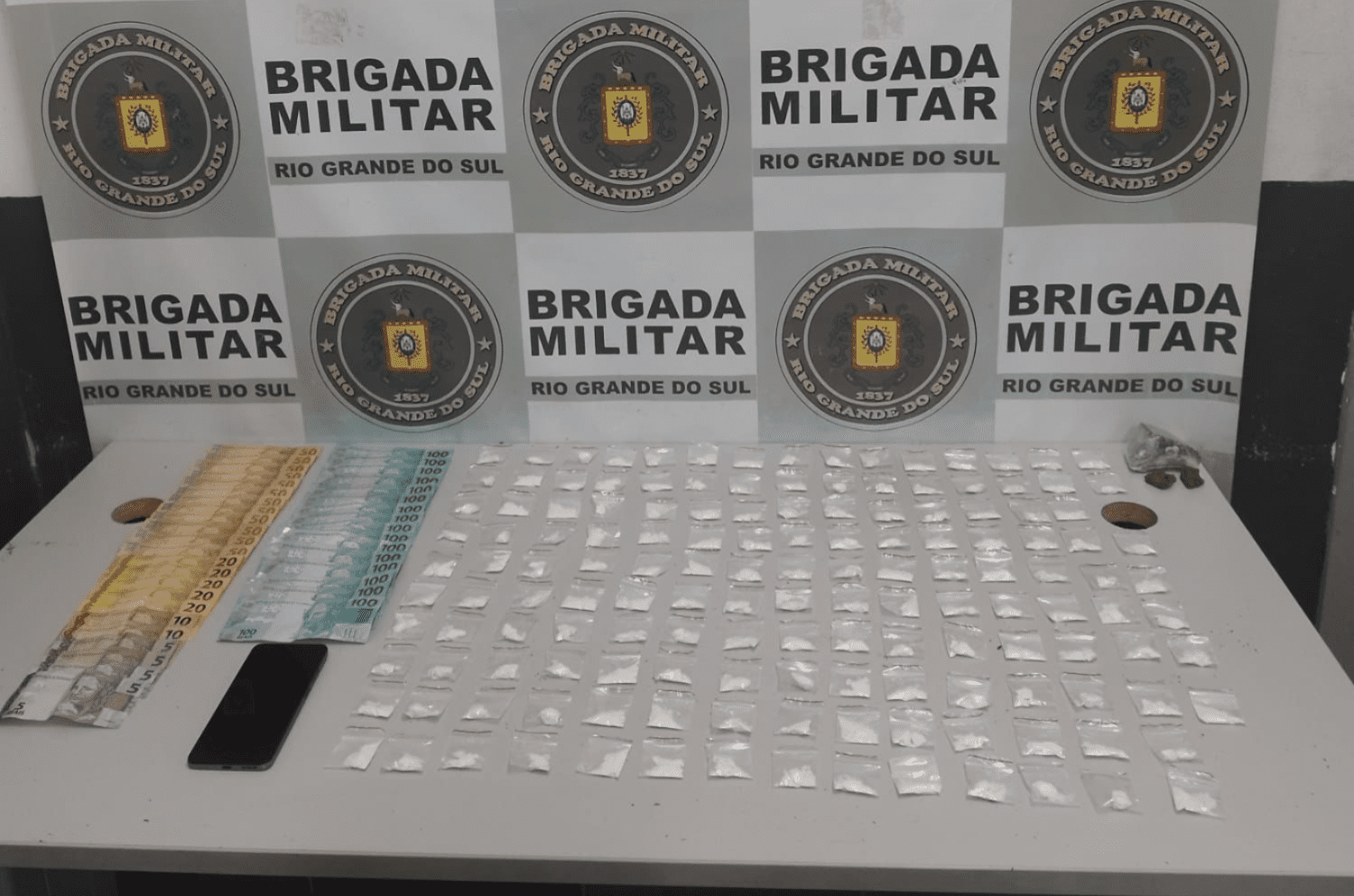 Durante a ação, os policiais encontraram 148 porções de cocaína (totalizando 197 gramas), três porções de maconha (61 gramas), R$ 2.340 em dinheiro, um veículo Hyundai HB20 e um celular. O homem foi conduzido à delegacia para os procedimentos legais.