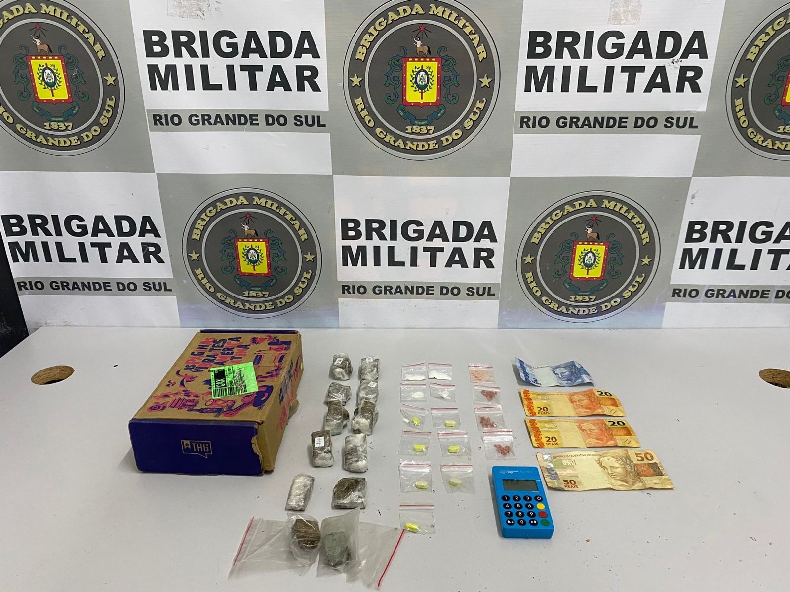Durante a abordagem, os policiais localizaram 169 gramas de maconha, 13 gramas de cocaína, 4,3 gramas de ecstasy, 3,1 gramas de MD, além de uma maquininha de cartão e R$ 92 em dinheiro.